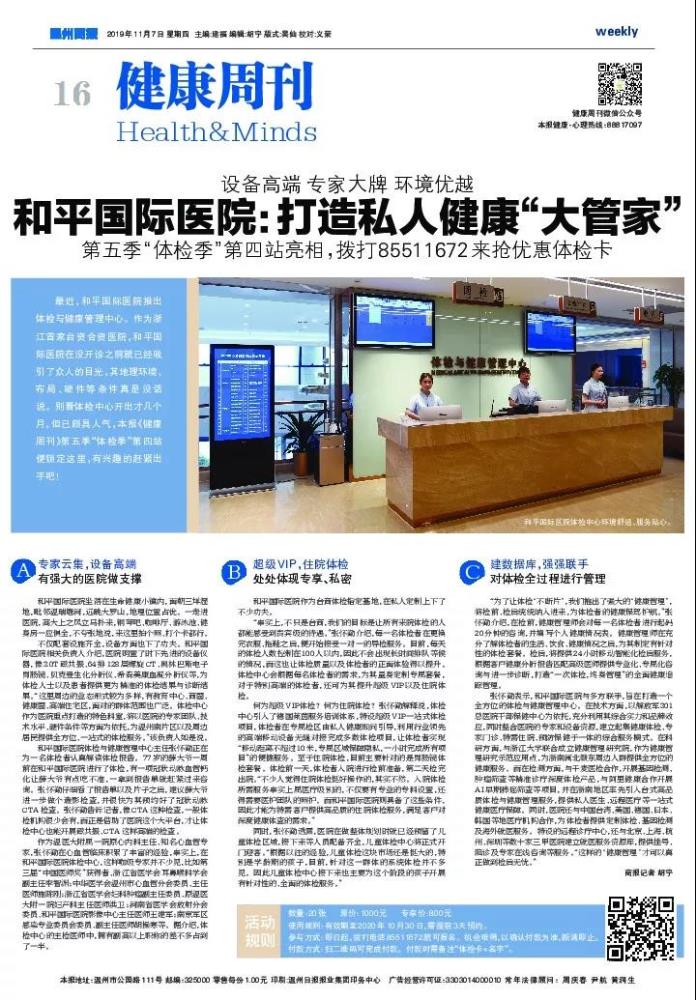 最近,和平國(guó)際醫(yī)院推出體檢與健康管理中心。作為浙江首家臺(tái)資合資醫(yī)院,和平國(guó)際醫(yī)院在...