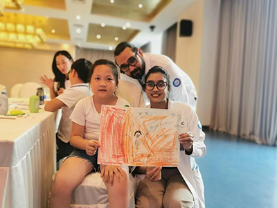 生命是如此可敬、可貴,在感受過生命孕育的偉大后,和平國際醫(yī)院的跨國醫(yī)生,來自毛里求斯的蘇瑪和來自巴基斯坦的豪孟德給現(xiàn)場的小朋友分享了發(fā)生在他們身上的抗疫故事。現(xiàn)場互動不斷,氣氛高漲,有些小朋友甚至直接和蘇瑪用簡單的英文進(jìn)行交流。