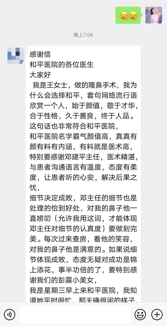 特別感謝鄧建平主任,醫(yī)術(shù)精湛,溝通語言有溫度,態(tài)度有柔度,讓我聽了很安心......細(xì)節(jié)決定成敗,鄧主任(做鼻子)的細(xì)節(jié)處理得恰到好處......每次過來查房,看到他的笑容,我就知道對我鼻子(的手術(shù)效果)他是滿意的。