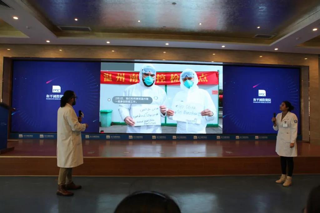 作為溫州最美抗疫人,和平國(guó)際醫(yī)院的跨國(guó)醫(yī)生,來(lái)自毛里求斯的蘇瑪和來(lái)自巴基斯坦的豪孟德分享了他們的抗疫故事。“在疫情期間,家里人讓我回去,但是我拒絕了,我必須留在這里,這是我的使命。”蘇瑪說(shuō)道。同學(xué)們紛紛為她的精神鼓掌。
