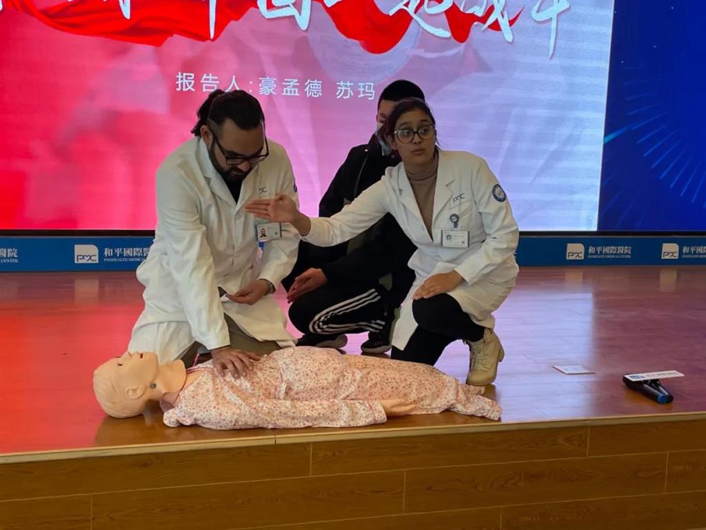 為了增強(qiáng)同學(xué)們的救護(hù)意識(shí),分享完抗疫故事后,蘇瑪和豪孟德根據(jù)在生活中常遇到的突發(fā)狀況介紹了人工徒手心肺復(fù)蘇的重要性,結(jié)合實(shí)際救護(hù)技巧進(jìn)行了詳細(xì)講解,并現(xiàn)場(chǎng)通過(guò)“模擬人”向在座學(xué)生進(jìn)行心肺復(fù)蘇的演示。