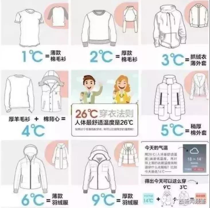 較厚羽絨服相當(dāng)于9℃,薄款羽絨服是6℃,稍厚棉外套5℃,厚羊毛衫加棉背心4℃,抓絨衣、薄外套3℃,厚棉毛衫2℃,薄棉毛衫是1℃等。