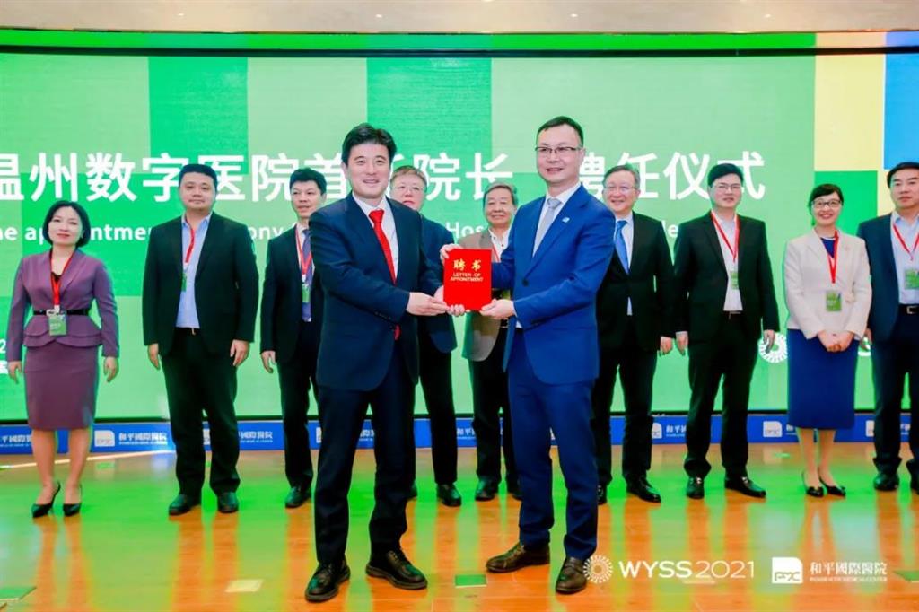 微醫(yī)集團(tuán)總裁王陽(yáng)為和平國(guó)際醫(yī)院院長(zhǎng)薛志輝為頒發(fā)溫州數(shù)字醫(yī)院首任院長(zhǎng)聘書(shū)。