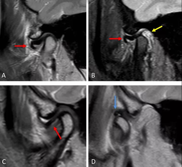 B圖示:張口位時,顯示關(guān)節(jié)盤移位(紅色箭頭),關(guān)節(jié)積液(黃色箭頭)。病例2:斜矢狀平面上的質(zhì)子密度加權(quán)圖像(PDWI)