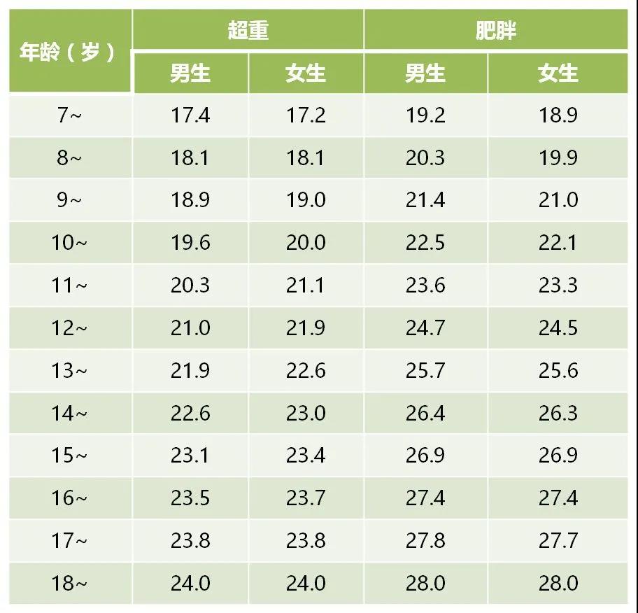 我們可以參照一個(gè)指標(biāo)——體質(zhì)指數(shù),簡(jiǎn)稱BMI。BMI的計(jì)算公式為體重(kg)除以身高的平方(㎡)。再參照BMI篩查數(shù)值標(biāo)準(zhǔn)表,就可以判斷孩子是否超重或肥胖了。