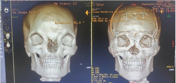 和平國(guó)際醫(yī)院舉全院之力,組織腦外科、整形外科、創(chuàng)傷與創(chuàng)面修復(fù)科、神經(jīng)外科、影像科、麻醉科等召開(kāi)專家MDT會(huì)診。醫(yī)院邀請(qǐng)上海九院整形外科主任醫(yī)師、顱頜面外科領(lǐng)域權(quán)威專家韋敏教授以及省內(nèi)三甲醫(yī)院專家指導(dǎo)會(huì)診,共同研討治療方案、進(jìn)行手術(shù)模擬設(shè)計(jì)、制定手術(shù)方案和圍手術(shù)期救治預(yù)案,周密安排術(shù)前準(zhǔn)備和術(shù)后監(jiān)護(hù)處理。