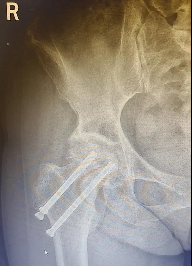 據(jù)李女士自述,自己于3年前因外傷致右股骨頸骨折,當(dāng)時(shí)在其他醫(yī)院做了右股骨頸骨折閉合復(fù)位螺釘內(nèi)固定術(shù),一年后右髖出現(xiàn)疼痛并逐漸加重,且休息不能緩解,行走時(shí)就像有座山壓身上一樣。結(jié)合病癥表現(xiàn)及影像顯示,李女士被診斷為“右股骨頸骨折術(shù)后股骨頭壞死”,需要盡快做手術(shù)。 (△術(shù)前影像,右股骨頸骨折內(nèi)固定術(shù)后股骨頭壞死)