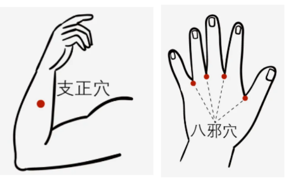 1.按揉支正穴。支正穴位于人體前臂背面尺側(cè),從手掌根往上5寸(約6個(gè)橫指的距離),在肉和骨頭的中間,摸到骨縫里的痛點(diǎn)。2.摩擦八邪穴。位于手背第1~5指間指蹼緣后方赤白肉際處,左右共8穴。