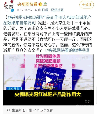 一次是央視報道,有人從閑魚上買減肥藥,買了之后雖然有效,但是副作用很大,經(jīng)過檢測里邊含有非常高劑量的西布曲明。