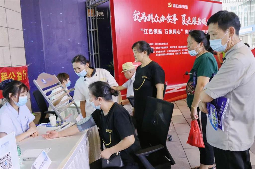 7月30日下午兩點(diǎn)半,在淅淅瀝瀝的小雨聲中,和平國(guó)際醫(yī)院“紅悅工程”攜手南白象街道黨工委、溫州萬(wàn)象城、南白象街道社區(qū)衛(wèi)生服務(wù)中心、南白象街道黨群服務(wù)中心,來(lái)到溫州華潤(rùn)萬(wàn)象城,為商場(chǎng)顧客、員工帶來(lái)了新冠疫苗接種咨詢、健康咨詢、量血壓、測(cè)血糖等義診服務(wù)。