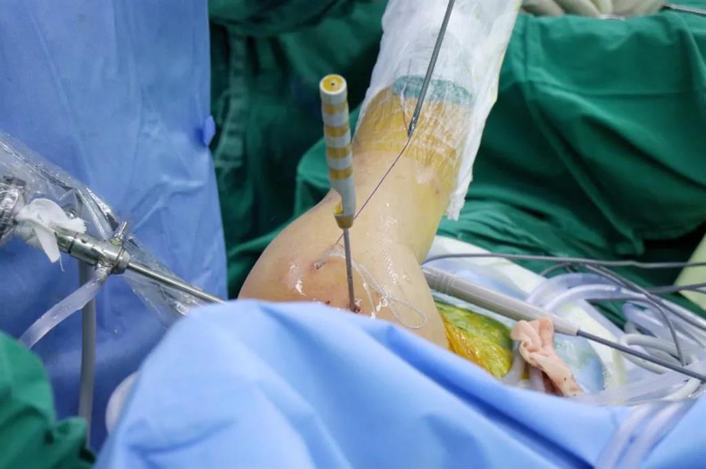 此外,和平國(guó)際醫(yī)院關(guān)節(jié)鏡微創(chuàng)團(tuán)隊(duì)還完成了一例交叉韌帶修復(fù)術(shù)。此手術(shù)采用三個(gè)約0.5cm的微小創(chuàng)口,于脛骨結(jié)節(jié)處進(jìn)行定位,后鉆通脛骨隧道,應(yīng)用多種袢鈦板進(jìn)行多位置固定,手術(shù)過(guò)程短,創(chuàng)口小,術(shù)后效果好,患者十分滿意。