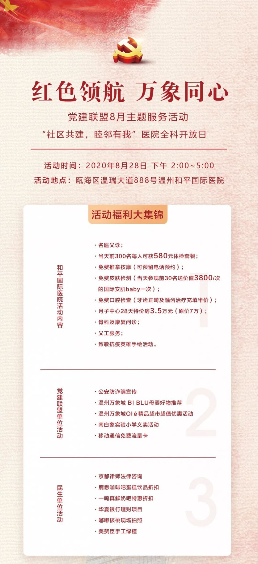 8月28日,甌海區(qū)南白象街道“紅色領航 萬象同心”黨建聯(lián)盟聯(lián)合多方力量,將在和平國際醫(yī)院舉行全科開放日活動,現(xiàn)場有近20家黨建聯(lián)盟單位及愛心商家,共計提供30多項福利,寓教于樂,縱享精彩。