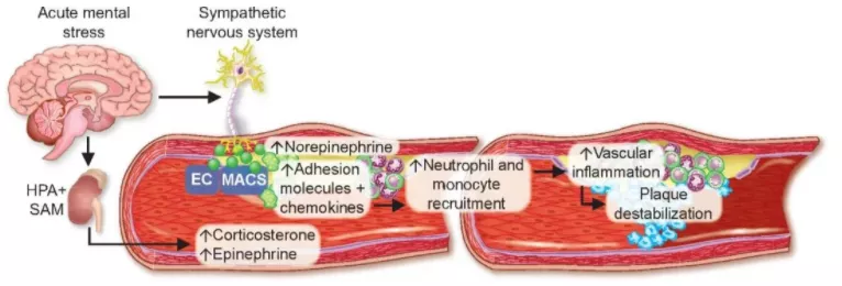 德國慕尼黑工業(yè)大學(xué)的研究人員發(fā)現(xiàn),生氣、憤怒、沮喪等(急性精神壓力下)會通過壓力激素,讓血液中的炎癥性白細胞遷移到主動脈,導(dǎo)致動脈中的粥樣硬化斑塊破裂。